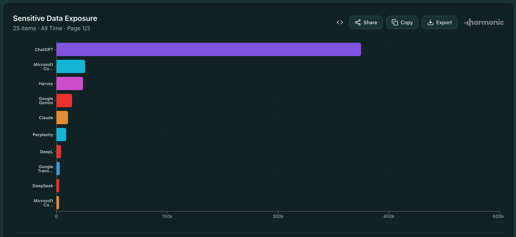 The majority of usage is ChatGPT and through personal accounts. At the FutureCon conference, Mariana Padilla with Harmonic Security gave an amazing talk. In her "The AI Genie Is Already Out of the Bottle- Now What?" presentation, Mariana shared the aiusageindex.com research that her team at Harmonic Security conducted, and it backs this up. Go take a look at which tools are used the most and which have the most sensitive data submissions.